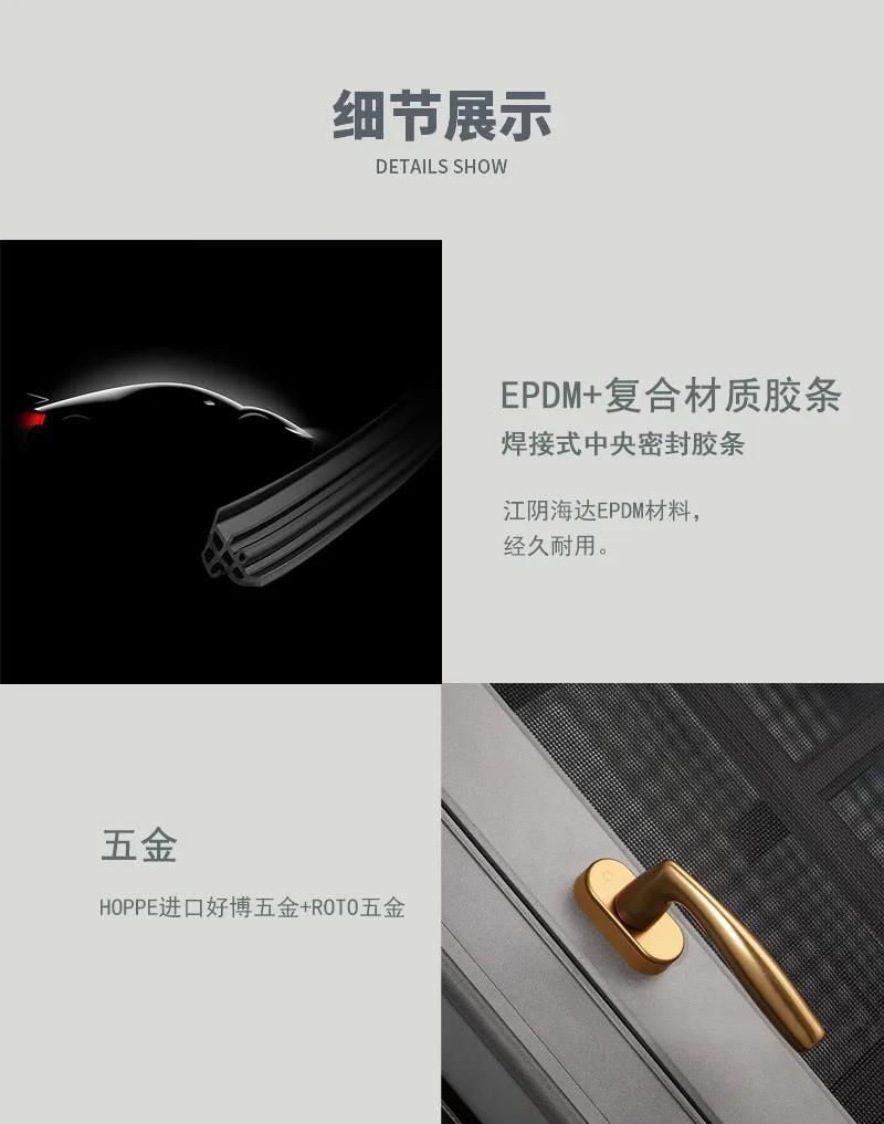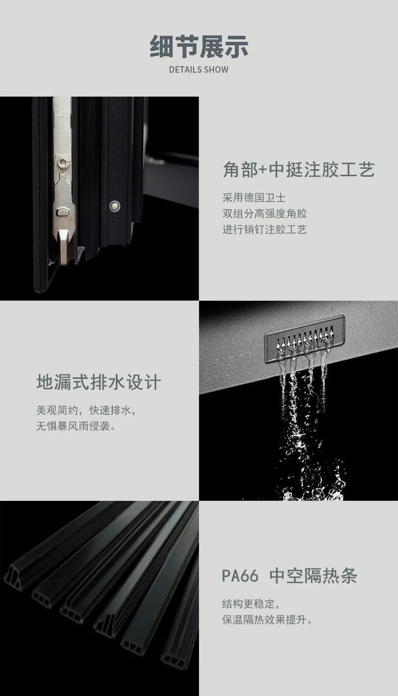 框扇齊平設(shè)計,金屬表面處理工藝,室外免打膠,防翹, 外觀現(xiàn)代、輕奢,美觀整潔。