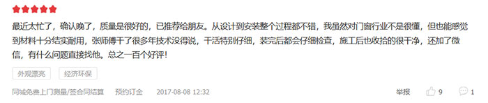質(zhì)量是很好的,已推薦給朋友。從設(shè)計(jì)到安裝整個(gè)過(guò)程都不錯(cuò),我雖然對(duì)門窗行業(yè)不是很懂,但也能感覺(jué)到材料十分結(jié)實(shí)耐用,張師傅干了很多年技術(shù)沒(méi)得說(shuō),干活特別仔細(xì),裝完后都會(huì)仔細(xì)檢查,施工后也收拾的很干凈,還加了微信,有什么問(wèn)題直接找他。總之一百個(gè)好評(píng)!
