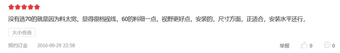 沒(méi)有選70的就是因?yàn)榱咸珜?,顯得很檔視線,60的料細(xì)一點(diǎn),視野更好點(diǎn),,尺寸方面,正適合,安裝水平非常不錯(cuò)。